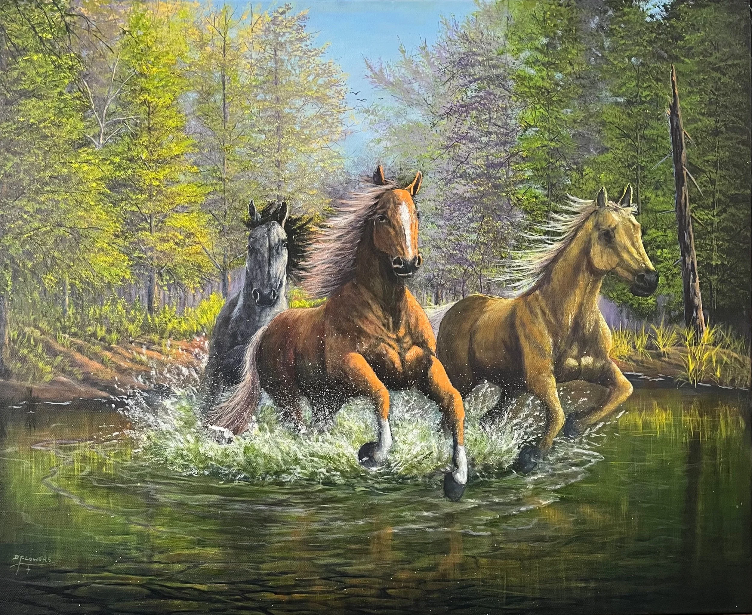 A breathtaking tribute to nature’s raw beauty and wild spirit, Echoes in the Stream captures the powerful motion of three horses thundering through a sun-dappled forest stream. The autumn foliage glows in golden tones, dancing in contrast with the rippling water and the dynamic energy of the horses. Each brushstroke radiates strength, freedom, and grace — a moment frozen in time, where the echo of hooves and the splash of water stir the soul.